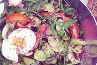 ingrédients pour une personne seule et abandonnée qui mange devant la tv (moi par exemple) : 1 oeuf3 petites tranches de bacon1 tomatequelques champignons1 demi avocatroquetteoignon rouge