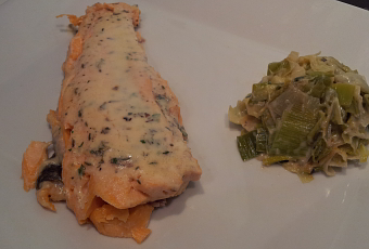 4 poireaux/ crème semi epaisse 4%/moutarde/ une noisette de beurre/ sel / poivre / un filet de truite