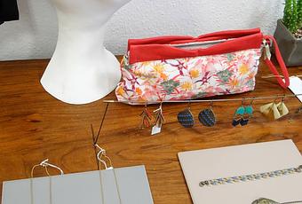 D'un côté, Julie Meuriss avec une sélection d'accessoires allant de la petite maroquinerie à de grands sacs week-end. Le tout en cuir et tissu.