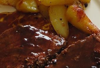 Servez le rôti tranché, (enlevez la croûte de poivre avant de servir je ne l'avais pas fait et trop fort) parsemé de fleur de sel et accompagner de la sauce.