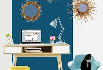 Voici donc deux petits « collages » que je me suis fait pour me donner une idée du rendu. La couleur viendrait en aplat sur le mur, du sol au plafond. Le jaune sur les deux pans de murs, le bleu en une bande unique face au bureau.