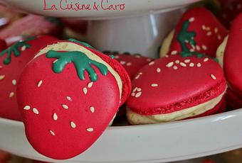 1. Réaliser l'appareil à coques de macarons. Dresser à la poche à douille des macarons en forme de fraises. Saupoudrer de graines de sésame. Cuire puis garnir et décorer