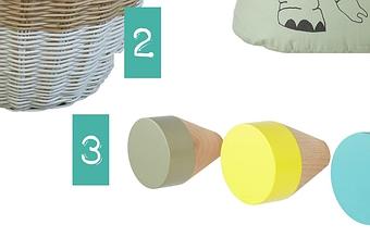 #1 Pouf Ferm Living #2 Corbeille de rangement N74 #3 Patères clou Eno#4 Tirelire Maison Ferm Living - #5 Statuette Bang bang Kid -