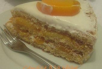 Mouillez un disque de génoise avec du sirop de pêche puis mettez une couchez de crème chantilly et placez des morceau de pêche.