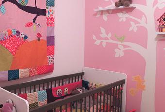 Pour la chambre bébé de Mathilde, qui avait besoin d'un petit coup de pep's : "[...] THEME : hiboux; COULEURS : Nous prévoyons pour la nouvelle chambre de notre fille une dominante de " rose fuchsia - rose pâle - mauve - vert anis - jaune - orange - rouge " [...] Nous aurions aussi souhaité qu'une chenille apparaisse dans le décor (sur la couverture par exemple)... Peut-être aussi des champignons ! [...] N ous aimerions que le thème du hibou entre dans celui plus global " animaux de la forêt ". Nous pensons donc intégrer une niche à oiseau, un arbre peint sur un mur, quelques animaux par ci et là..."