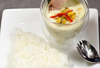 Ajouter les moules décoquillées et le lard coupé en morceaux de 1cm dans le curry vert. Servir avec un riz thaï au jasmin. Ajouter un trait de citron vert, décorer de coriandre, coquilles de moules, julienne de piments, etc…