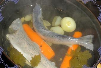 Laisser frémir. Les truites vidées et prestement nettoyées sont plongées dans le court-bouillon quelques minutes (8 à 10 minutes maximum) seulement.