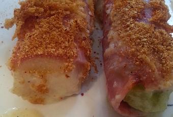 Couper les poireaux en 2 et rouler chaque moitié dans une demi tranche de jambon.