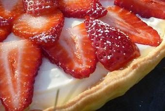 - Étalez la crème au mascarpone sur le fond de tarte et disposez les lamelles de fraises sur le dessus.