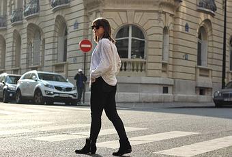 Boots : Zadig & Voltaire / Jeans : Kookaï / Chemisier : Vintage / Lunettes : Rayban / Perfecto : Zadig & Voltaire / Rouge à lèvres : Vernis à lèvres d'YSL