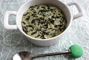 Répartir la crème dans un ramequin, parsemer des paillettes de spiruline restantes et réserver au frigo pendant 1h, afin de consommer cet entremets bien frais.