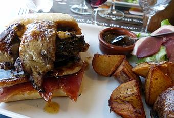 Je m'y suis régalée d'un énorme "Burger périgourdin" composé de magret de canard grillé en fines tranches et aussi fumé, de sauce barbecue, de confiture d'oignons, d'une tranche de jambon cru passé à la poêle mais surtout d'une généreuse escalope de foie gras frais poêlé. Vraiment de quoi rassasier un colosse ... pour 15.80 €.