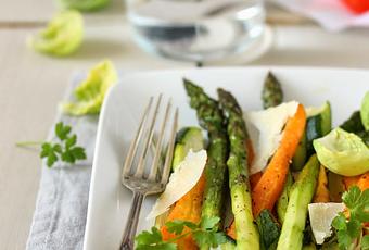 Je sers souvent les légumes rôtis en accompagnement d'une viande ou d'un poisson grillé. En entrée, c'est bon aussi. J'ajoute tout simplement quelques copeaux de fromage et des herbes fraîches.