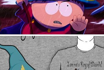 Le 1er visuel proposé représentait Cartman, icône de South Park, en fameux "Grand Mage" (Wizard) légendé d’un simple "Choose a side" ! Après consultation via l’UbiShop, eBay, Amazon et autres sites classiques, aucun indice n’a abouti à un semblable vêtement ! Plusieurs hypothèses ont été envisagées : s’agit-il d’un article promotionnel ? (Implicitement, South Park Le Baton de la Vérité aurait-il été livré dans un ensemble médiatique / promotionnel réservé à la Presse ?) D’un Tee Shirt réservé au marché Américain ? (Le présentateur parle de vêtements "bloqués à la douane") D’une édition limitée distribuée lors d’un grand événement vidéoludique ? (Type E3? Evénements que l’on sait "riche en produits dérivés" et "cadeaux"?) Ou encore d’un article produit en exclusivité pour une hypothétique boutique officielle South Park ?