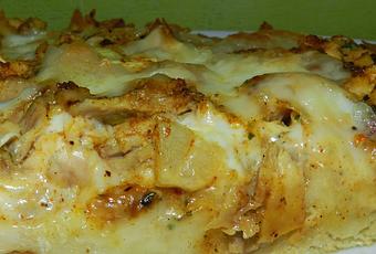 - Répartir dessus le demi-oignon haché, le poulet coupé en petits morceaux.