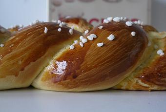 Badigeonnez votre tresse avec un jaune d'oeuf. Déposé quelque perles de sucre et enfournez à 180° pendant 20 minutes