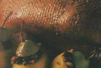 - Mettez les poires farcies dans le plat autour de la canette, afin qu’elles réchauffent pendant la cuisson de la volaille.