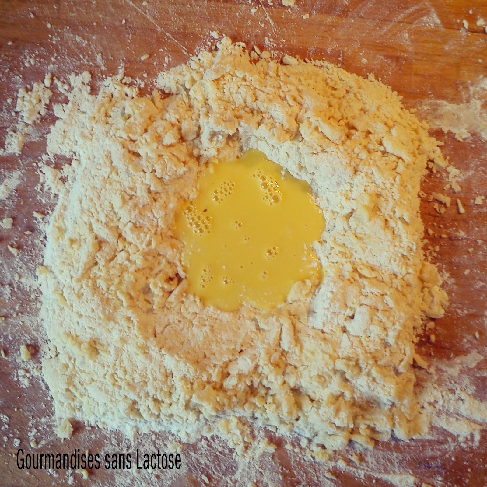 3. Délayer le jaune d'oeuf avec un peu d'eau. Et verser au milieu de la fontaine.Mélanger.