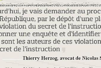 Maître Herzog a annoncé être sur le sentier de la guerre contre la mystérieuse source de Mediapart dans l’affaire des écoutes de Nicolas Sarkozy. « Aujourd’hui, - 21 Mars 2014 -, je vais demander au procureur de la République, par le dépôt d’une plainte pour violation du secret de l’instruction, d’ordonner une enquête et d’identifier quels sont les auteurs de ces violations du secret de l’instruction » [...] « C’est-à-dire qui a remis à Mediapart les rapports tronqués qui ont été ainsi publiés hier, - le 20 Mars 2014 - » [...] « et je pense qu’on devrait sans difficulté pouvoir identifier très facilement le ou les auteurs. »