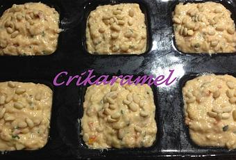 Pour faire mes mini-cakes, j'ai utilisé mes moules savarins carrés. J'ai donc rempli mes empreintes et j'ai parsemé la pâte du reste de pignons.