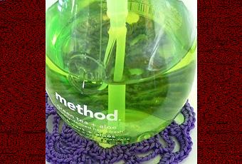 On nous avais prévenu…Grâce à Isabelle et aux défis des Sérial Crocheteuses … Chez moi… du crochet il y en a partout… et jusque dans la cuisine… Depuis cette semaine… un petit napperon c’est glissé sous mon savon pour les mains au thé vert et aloès Method. (une marque écolo, que j’adore… à découvrir d’urgence : le produit pour le bois à l’amande qui a la même odeur que les petits pots de colle blanche d’autrefois…) Toutes les participantes du SC214... en cuisine sont ici