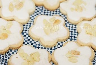 - Verser un peu de glaçage sur chaque biscuit et étaler régulièrement puis décorer d'amandes. Laisser durcir sur une grille à pâtisserie.