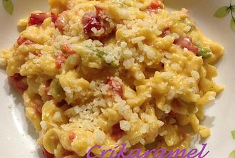 Ingrédients pour 5 personnes : 70g de parmesan - 100g d'oignons - 1 CS d'huile d'olive - 150g de poivron vert - 150g de poivron rouge - 5 tranches de bacon - 1 cube de bouillon de volaille - 250g de pâtes (coquillettes ou torsades) - 650g d'eau - 100g de crème fraîche liquide - sel - poivre