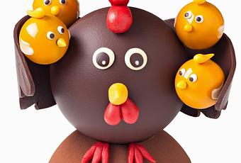 Sous ses ailes protectrices, la Mère Poule veille amoureusement sur ses quatre petits poussins en chocolat, qui babillent sereinement à l’abri des regards gourmands. A la dégustation on ne sait pas qui va glousser le plus...