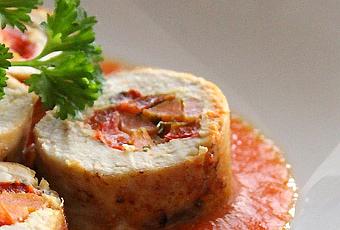 J'ai fait des ballotines d'escalopes de poulet farcis aux légumes que j'ai accompagné d'une sauce au poivron rouge. Le résultat était beau et bon à la fois !
