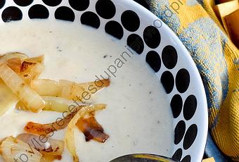 Mix to a smooth consistency. Add some more milk if too thick. Adjust seasoning if necessary. Serve by placing some caramelized onions on the surface.