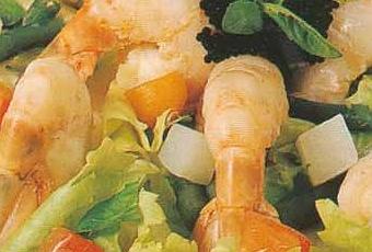 - Arroser les crevettes, la salade et la garniture de légumes de vinaigrette tiède et accompagner d’œufs de saumon.