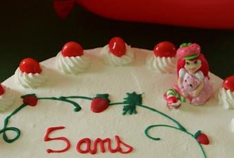 5. Décorer avec le reste de chantilly à la poche à douille cannelée. Disposer les bonbons fraises. Réaliser les dessins et écriture en faisant fondre le candy melt et en le plaçant dans un cornet à pâtisserie réalisé en papier sulfurisé.
