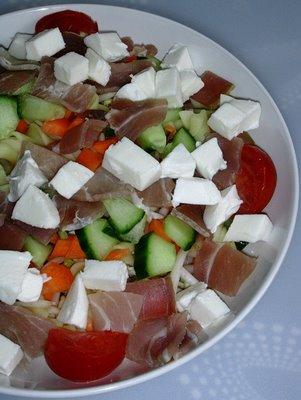 Détailler la carotte épluchée, le concombre, les tomates cerise, le jambon et la mozzarella en petits morceaux.