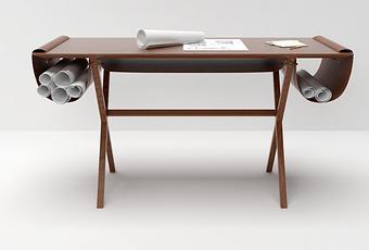 Le bureau inspiré de son nom à sa forme par l’architecte Oscar mêle bois et cuir, le plateau sur son piètement croisé se voit souligné par deux espaces de rangement en cuir suspendu.