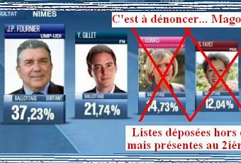 Voyant la tournure des événements, le Front de gauche nîmois décidait alors prudemment de reconduire son équipe du premier tour cinq minutes avant l'heure légale, en fait une heure bidonnée car le front de gauche s'est présenté en préfecture de Nîmes après 18 h 00