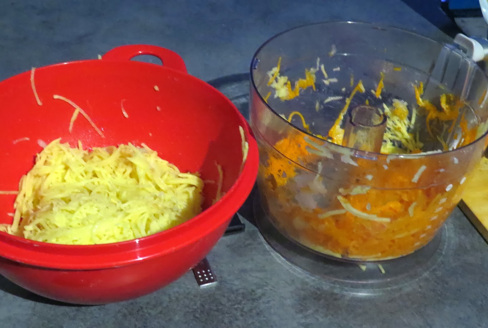 Éplucher vos pommes de terre ainsi que votre potiron (pas facile!), les laver et les râper à l'aide d'un robot ménager.Mélanger les pommes de terre et le potiron râpé dans un grand saladier.