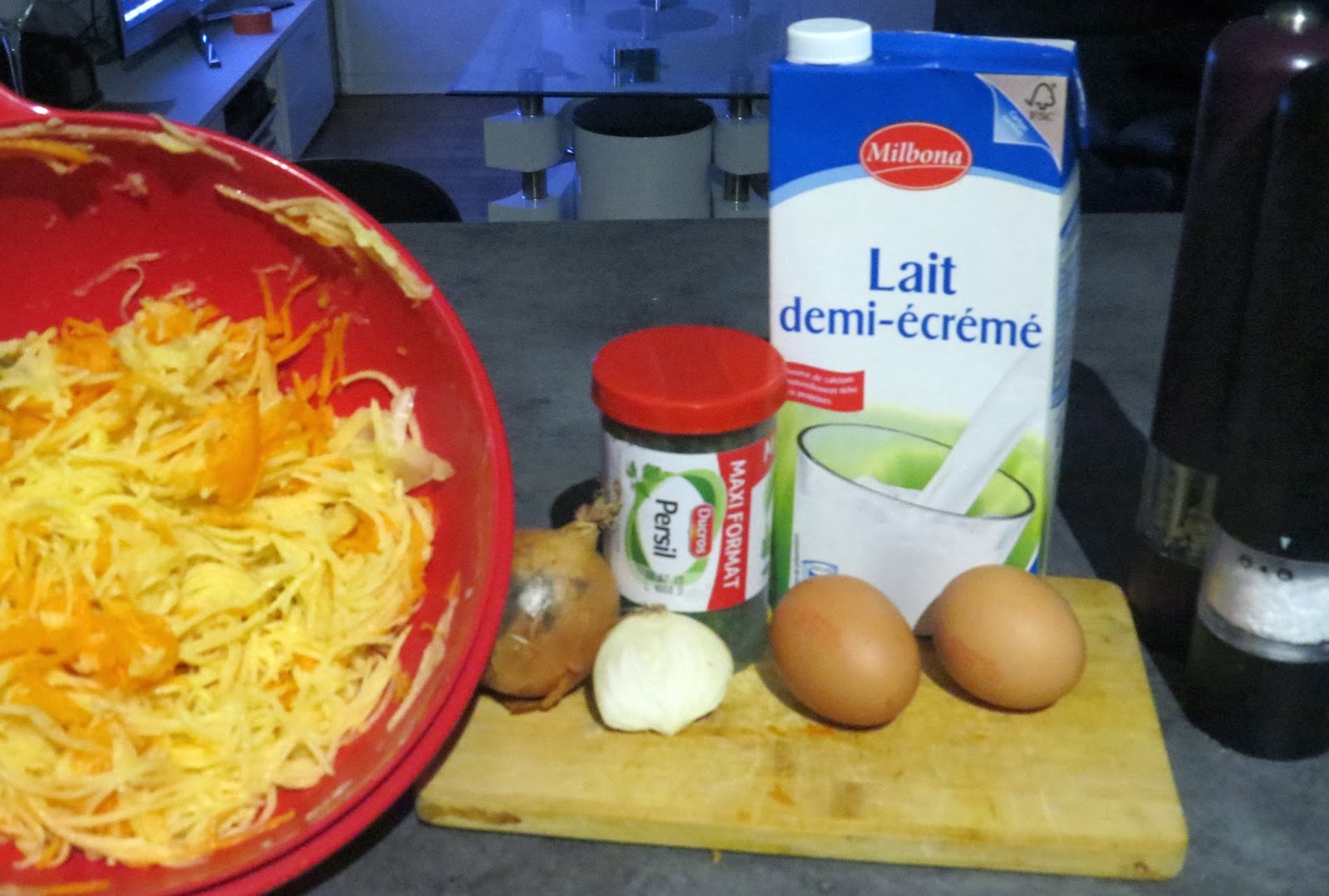 pour 2 personnes:Temps de préparation : 1 heures- 6 grosses pommes de terre- 1/4 d'un bon gros potiron- 3 oignons- 3 oeufs- 4 cuillère à soupe de farine- 1/2 verre de lait- huile- sel poivre- 1/2 bouquet de persilETAPE 1 :