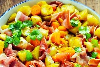 Ingrédients : 6 tranches de jambon cru bien fines – 350g de petites pommes de terre du type ratte du Touquet par exemple – 1 botte de navets nouveaux – 2 ou 3 carottes nouvelles – 1 botte d'oignons nouveaux – 1 rouleau de pâte feuilletée – 1 ou 2 càc de ras el hanout – 1càc de gingembre frais râpé – 1 càs d'huile d'olive – 1 petit verre de vin blanc – 60cl de bouillon de volaille – 1petit bouquet de coriandre effeuillé - 1càc de miel liquide – 1 jaune d'œuf -sel et poivre Lavez tout les légumes puis séchez-les. Coupez en petits tronçons les pommes de terre et les carottes épluchées. Coupez en quartiers les navets et les oignons.Versez l'huile dans une cocotte et faites la chauffer à feu moyen. Ajoutez les légumes, salez et poivrez et mélangez. Faites cuire 2 ou 3 minutes en remuant régulièrement. Ajoutez le ras el hanout, le gingembre et le vin et laissez-le complètement réduire. Ajoutez 40cl de bouillon et couvrez la cocotte, laissez cuire à petit frémissements pendant une quinzaine de minutes. Ajoutez le miel et poursuivez la cuisson pendant 5 minutes à découvert jusqu'à ce que les légumes soient cuits mais encore al dente.Versez tout le contenu de la cocotte dans un plat et ajoutez la coriandre, si le mélange est un peu sec ajoutez un peu de bouillon. Répartissez les tranches de jambon au milieu des légumes. Couvrez avec la pâte feuilletée, badigeonnez-la avec le jaune d'œuf, faites une petite cheminée au milieu de la tourte et décorez-la éventuellement avec la pointe d'un couteau ou en utilisant les reste de pâte.Enfournez pendant une quinzaine de minutes dans un four préchauffé à 180°, jusqu'à ce que la tourte soit joliment dorée. Servez bien chaud. Salade exotique charcutière