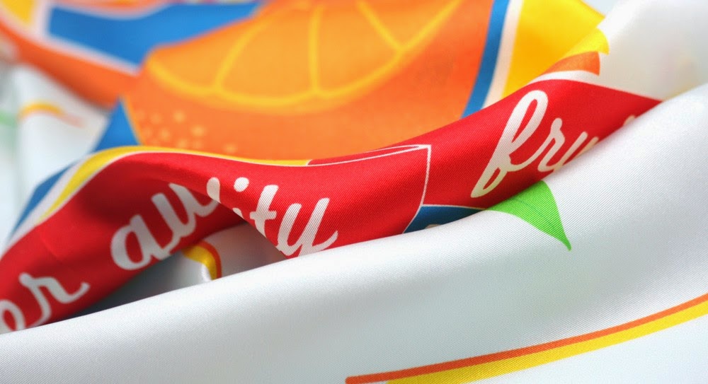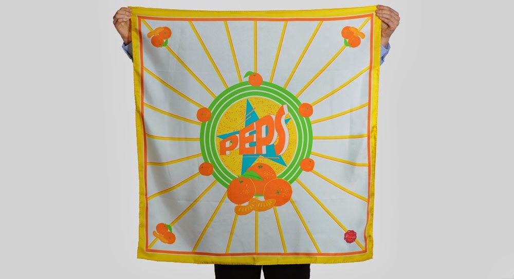 Inspirés d'emballages de fruits, évoquant des boissons au packaging rétro (un concept qui a également influencé Jeremy Scott pour Moschino), ces foulards de soie revisitent le traditionnel carré en lui apportant une note dynamique et aux coloris plein de peps certes airs mais avec ce petit je-ne-sais-quoi de délicieusement (c'est le cas de le dire!) nostalgique!