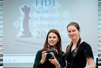 Les "2K" sont à Khanty Mansiysk. Pas Karpov contre Kasparov... mais les photographes, Nastya Karlovich et Eteri Kublashvili, qui immortaliseront le choc du jour entre le leader Anand face à Karjakin. - Photo © site officiel