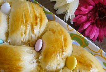 5) Badigeonner la brioche de jaune d'oeuf et de lait et enfourner 20 minutes th°5