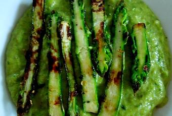 Faire tiédir la crème d'asperges puis dresser dans des assiettes creuses. Disposer la crème et poser harmonieusement les demi-pointes dorées sur la crème. Servir aussitôt.