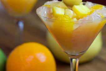 1) Dans une coupe dressez les segments d’oranges, puis le pamplemousse et posez dessus le tartare de mangue.
