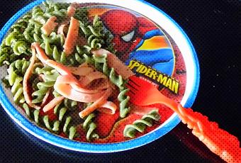 - des pâtes à la spiruline (Priméal)- 1 tranche de jambon/personne- un peu de beurre- 1 càc de sirop d'agave (Les ruchers du soleil)