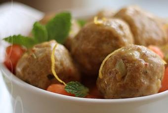 1)Dans un bol, mélanger les ingrédients des boulettes. Façonner 16 boulettes en utilisant environ 45 ml (3 c. à soupe) de préparation pour chacune d'elles.