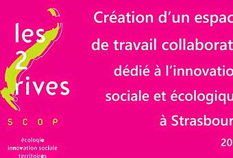 La Scop les 2 rives travaille depuis 2 ans au montage d'un espace collaboratif de travail dédié à l'innovation sociale et écologique, qui devrait bientôt voir le jour à Strasbourg,Cet espace a pour objectif d'offrir un lieu de travail, d'entre-aide et de coopération aux acteurs du changement : acteurs de l'ESS et entrepreneurs sociaux, dans une optique de mutation des pratiques professionnelles. Nous appelons acteurs du changement les professionnels qui œuvrent à travers leur activité à répondre de façon innovante à des enjeux de société environnementaux et sociaux pour lesquels il n'existe pas encore de réponse. Le lieu a pour vocation de les aider à s’identifier, à s'entre-aider, et à les relier à des réseaux compétents pour pérenniser et développer leur structure.