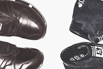 En résulte, une adidas Micropacer en cuir noir contrasté par des détails blancs et une adidas Official Mid ’80s noire et blanche en daim. On retrouve les logos des trois marques sur la languette, le talon et la semelle intérieure.