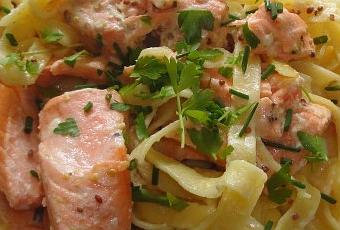 500 g de tagliatelles fraîches- 500 g de filets de saumon- 30 g de beurre- 6 cl de crème liquide- 2 cuill. à soupe de jus de citron- 1 cuill. à soupe de moutarde- 5 tiges de persil- Sel, poivre