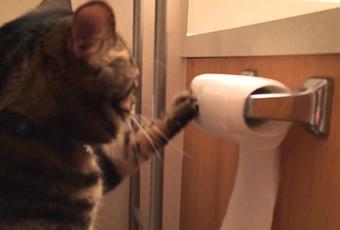 La plupart des chats déroulent le rouleau de papier toilette jusqu’à ce que ce ne soit plus possible mais pas ce chat là, lui il l’enroule après l’avoir dérouler. Autant dire qu’il peut y passer la journée…