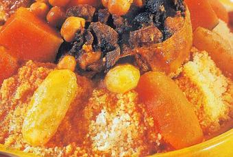 .Disposer le couscous en cône dans un grand plat , creuser le centre, y placer la viande et les légumes, arroser de bouillon et laisser absorber.